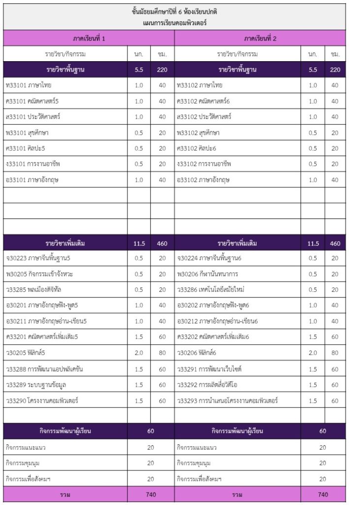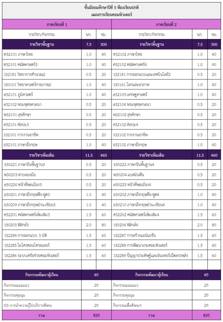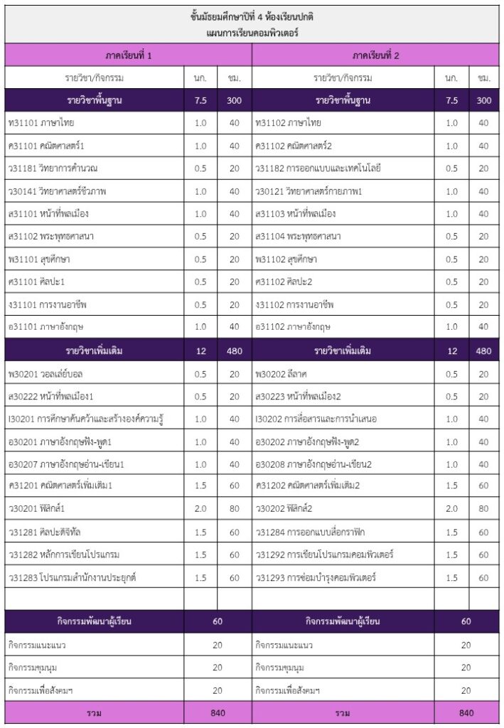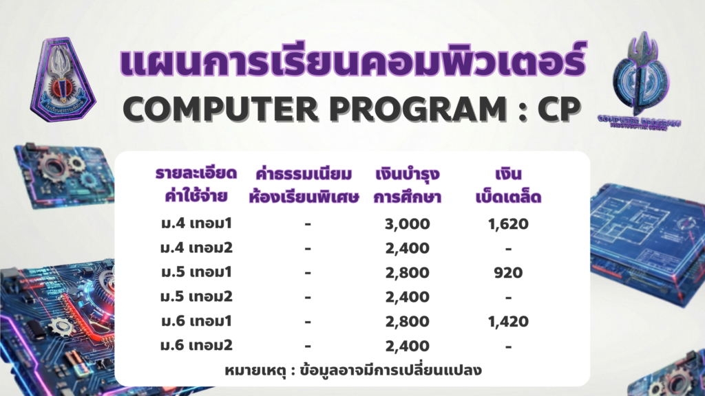 จัดการเรียนการสอน แผนการเรียนคอมพิวเตอร์ มุ่งเน้นพัฒนาผู้เรียนให้มีสมรรถนะสูงด้านเทคโนโลยีดิจิทัล ควบคู่กับการสร้างพื้นฐานทางวิชาการที่เข้มข้น โดยจัดรายวิชาเพิ่มเติมคอมพิวเตอร์ที่ทันสมัยตลอดหลักสูตร จำนวน 27 หน่วยกิต ครอบคลุมทั้งด้านกราฟิก การเขียนโปรแกรม และระบบเครือข่าย
